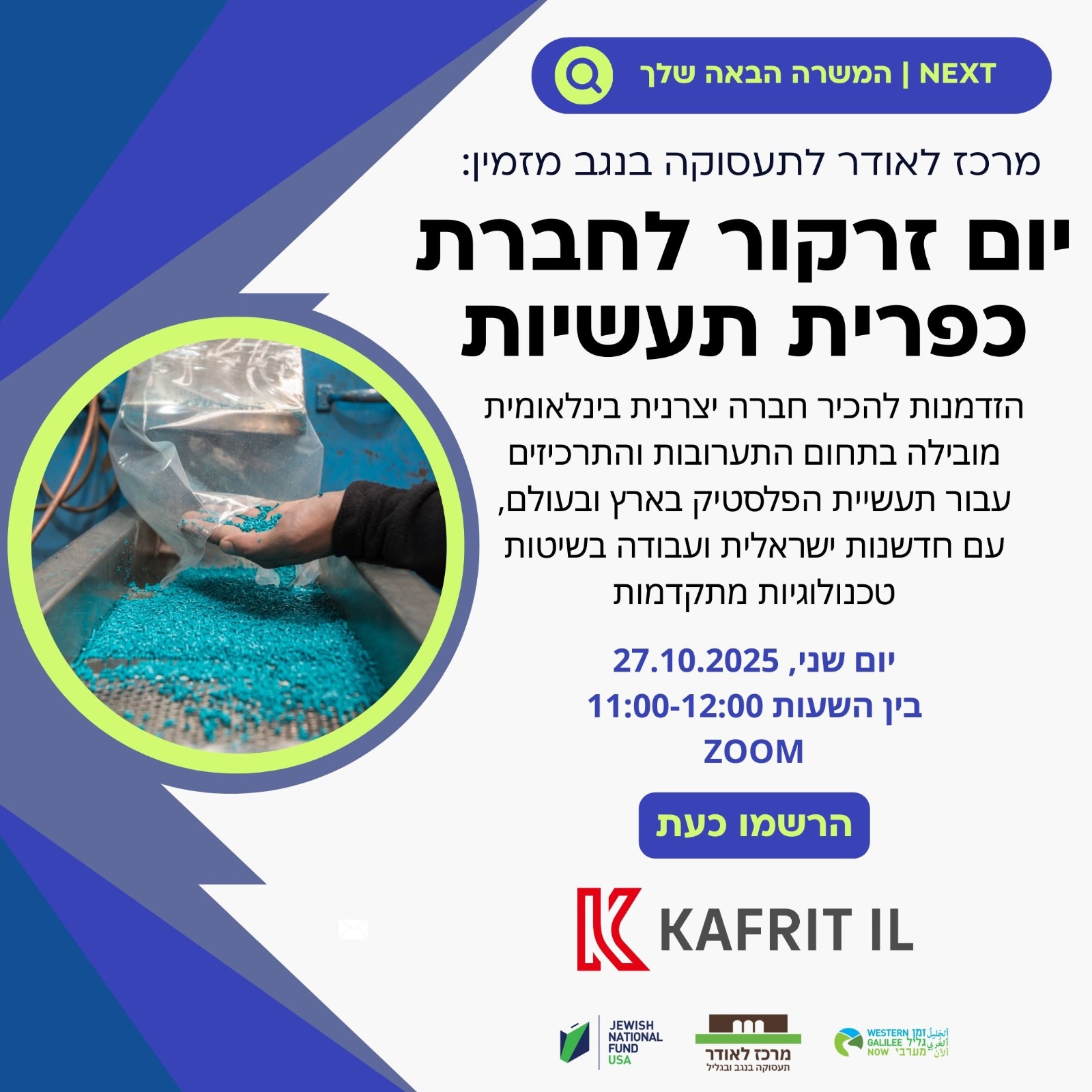 מרכז לאודר לתעסוקה בנגב מזמין אתכם להשתתף במפגש חשיפה עם קבוצת כפרית תעשיות, יצרנית בינלאומית מובילה בתחום התערובות והתרכיזים עבור תעשיית הפלסטיק בארץ ובעולם. החברה נמצאת בקיבוץ כפר עזה.